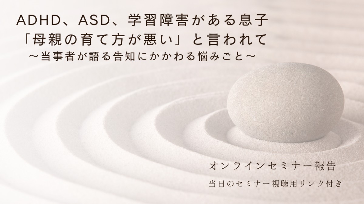今回のオンラインセミナーのタイトルは、『ADHD、ASD、学習障害がある息子 「母親の育て方が悪い」と言われて 〜当事者が語る告知にかかわる悩みごと〜』。現在24歳の息子さんの母親である野中美保さんは、発達障害に関する理解が広まっていない中での子育てで、孤軍奮闘してきた経験をお持ちです。
